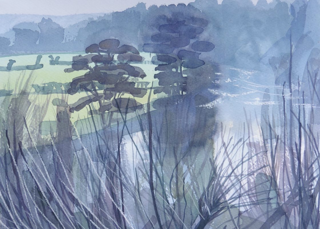 She lives in Oxfordshire, and now uses watercolour: painting landscapes, looking for particular conditions of light that can give a sense of fleeting luminous magic, when light conditions are aligned with colours and shapes of the landscape in a way that makes you hold your breath at the momentary beauty of the scene.