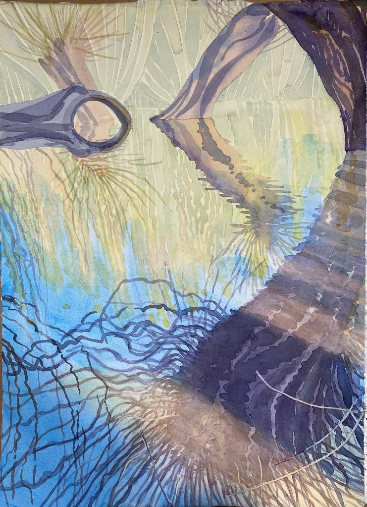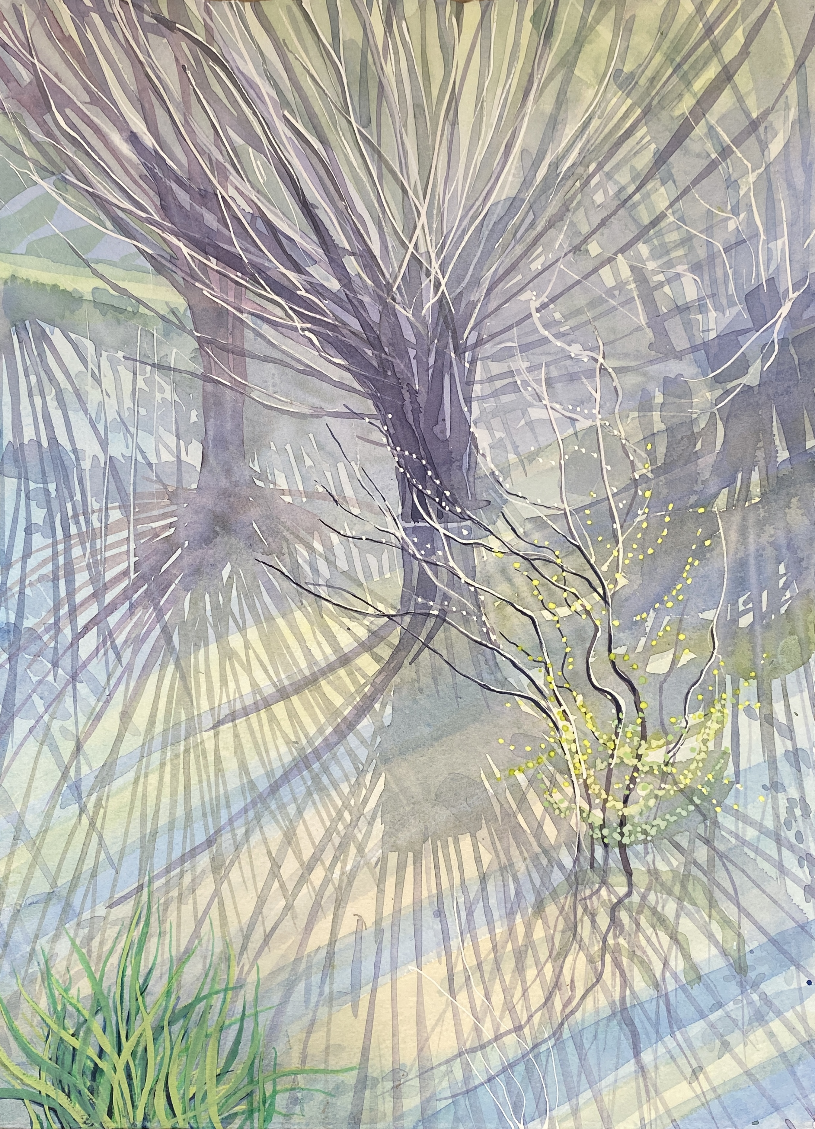 Ash Trunk Shadows, Mounted Watercolour, image size 20x28cm