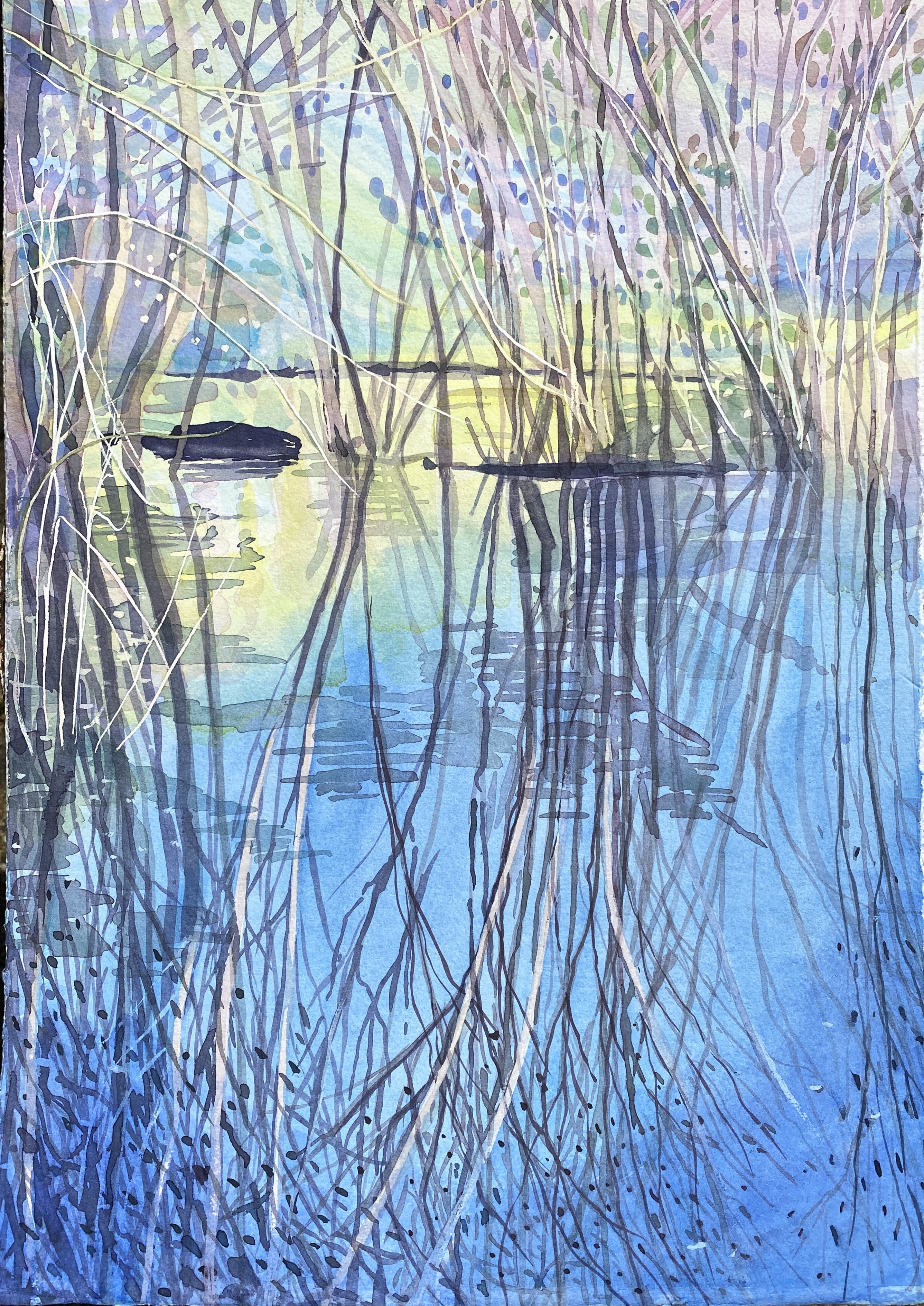 Flooded water meadow with Teasels, watercolour, 34x54cm